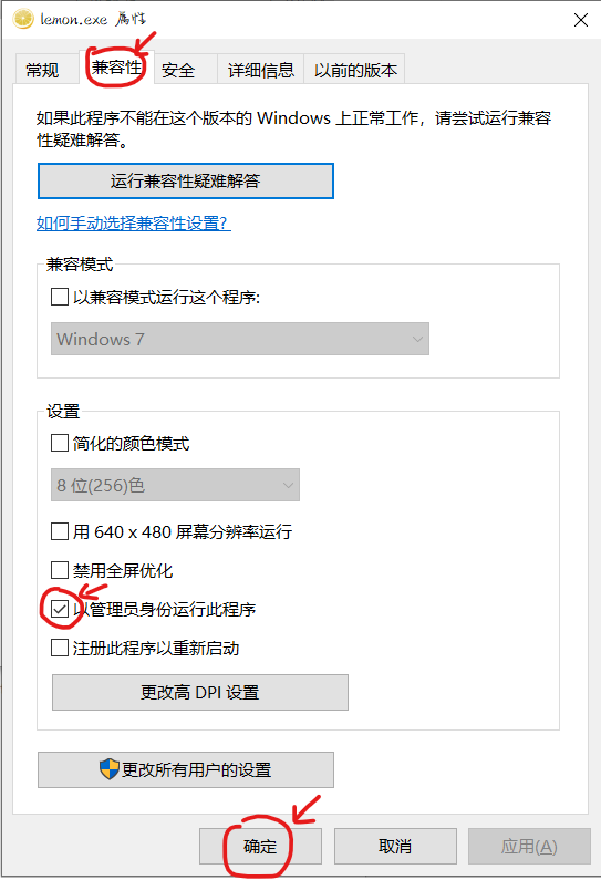 如果想永久设置,可以右键 lemon.exe,依次点击 属性——兼容性 选项卡——勾选 以管理员身份运行此程序——确定。