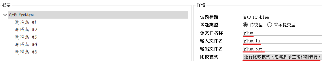详情中将源文件名称更改为代码文件名,输入输出文件名改为代码中freopen的文件名,比较模式更改为逐行比较方式(忽略多余空格和制表符),如果是Special Judge,选择自定义检验器模式,在下方出现的框中填写checker.cpp的位置。