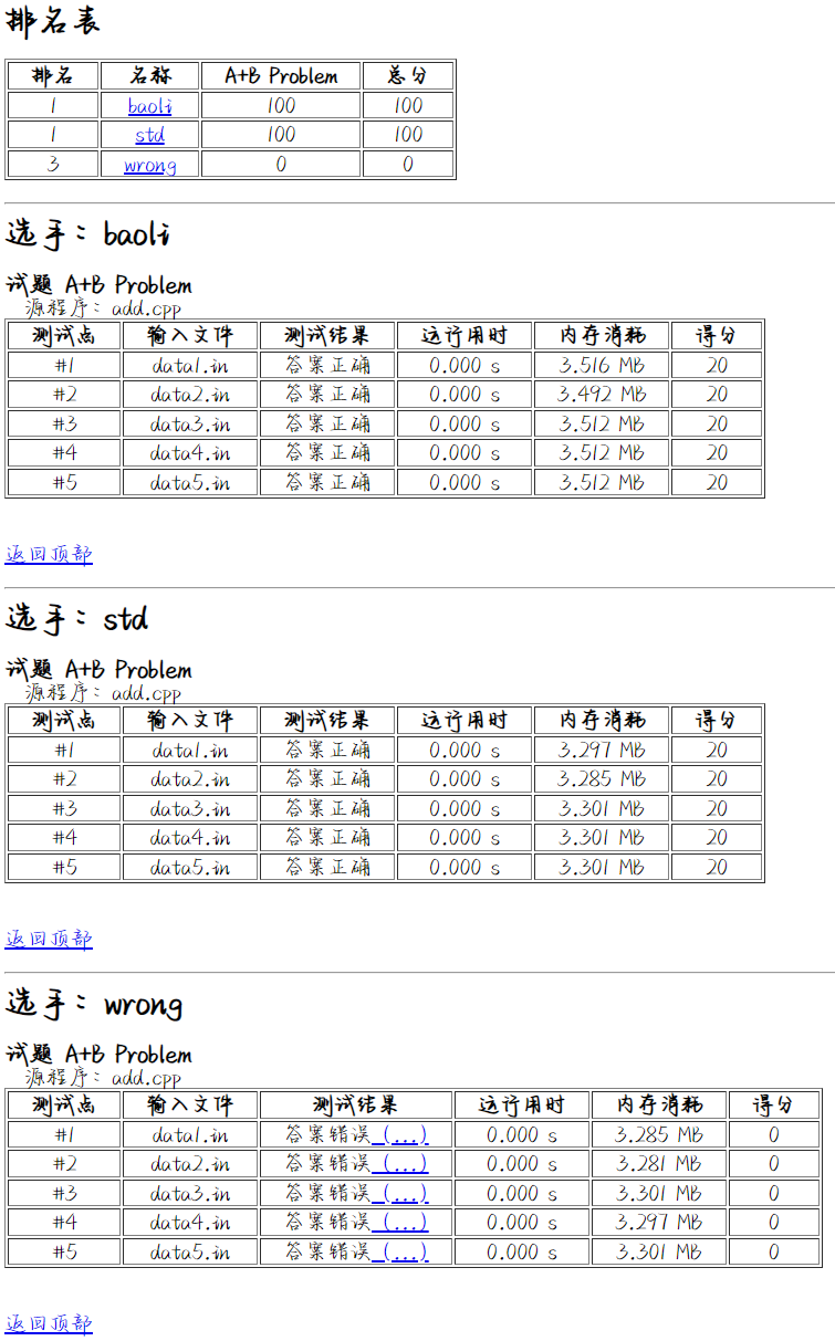 data存放题目数据,子目录名称是题目的名称,里面放的文件以.in和.out或.in和.ans搭配,文件名末尾必须有数字,且从 \(0\) 或 \(1\) 开头,后面的文件数字要连续。source存放选手代码文件,子目录名称是选手的名称,里面放后缀名为.cpp/.cc/.c等的文件。