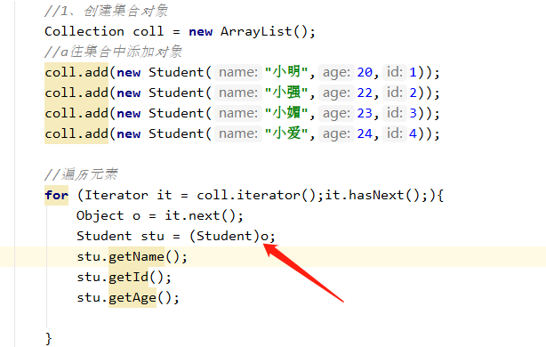这是一个获取迭代器的方法,调用此方法返回一个迭代器。该对象给出了遍历取出集合元素的一种通用的方法:先判断集合中还有没有下一个,有就取出,通过循环去遍历。对于while循环和for循环,取出的效果是一样的,但是for循环会更节省内存一点,因为for循环定义的局部变量迭代器对象在循环结束是就会被清理,而while循环定义的是一个全局变量。前面提到,集合在存储时不论是否为对象,最后都会转换成对象。所以在取出时是一个Object类型的变量,此时如果想获取原来的类型,则需要强转。