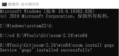 我的系统是64位,进到win64目录,执行命令: nssm install gogs
