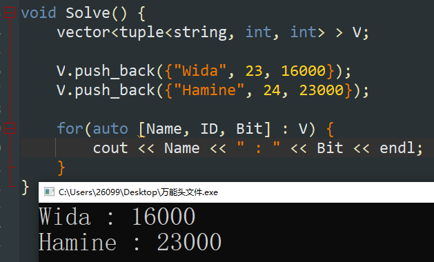【C++17】使用 \(\tt{auto}\) 可以取出容器中的三元组,如下例。