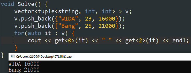 使用 get<index>(obj) 可以获取 \(\tt{obj}\) 对象中的第 \(obj\) 个元素,如下例。但是需要注意的是, \(\tt{index}\) 只能手动输入,而不支持动态输入(例如,用 \(\tt{for}\) 循环输入是不可以的)。