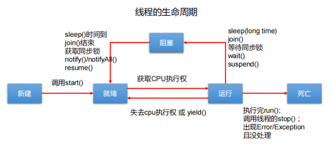 线程的生命周期一共分为五个状态:新建、就绪、运行、阻塞、消亡。