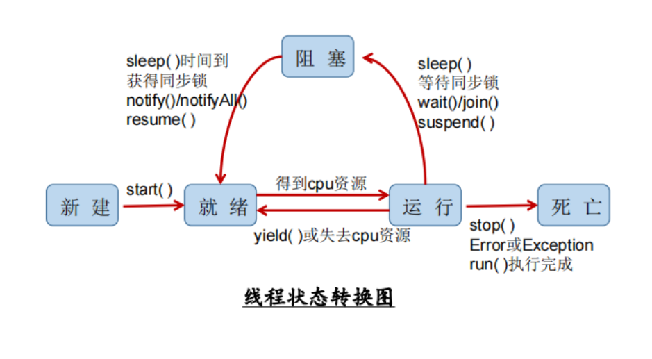 原理(非常重要): 线程新建之后调用start()方法进入就绪状态,在就绪状态的线程表示有权利去获取CPU的时间片。当在就绪状态中的线程抢到CPU时间片后通过调用run()方法执行程序(这个时候就代表进入了运行状态),当抢夺到的CPU时间片用完后再次进入到就绪状态,重新等待抢夺CPU时间片。当抢到CPU时间片后再次进入运行状态通过run()方法继续执行未完成的程序,如果线程中途遇到阻塞事件(如等待键盘的输入等)则线程就进入到阻塞状态,当阻塞解除后,线程再次回到就绪状态以等待抢夺CPU时间片,如此循环,直到该线程抢到的时间片够把整个程序运行完,然后run()方法结束,该线程就会进入消亡状态。