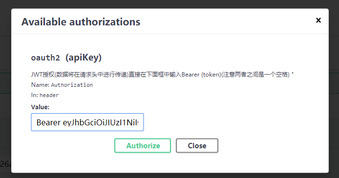Description = "JWT授权(数据将在请求头中进行传递)直接在下面框中输入Bearer {token}(注意两者之间是一个空格) \"",