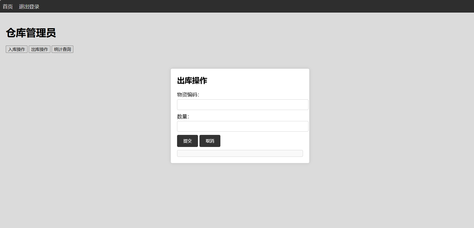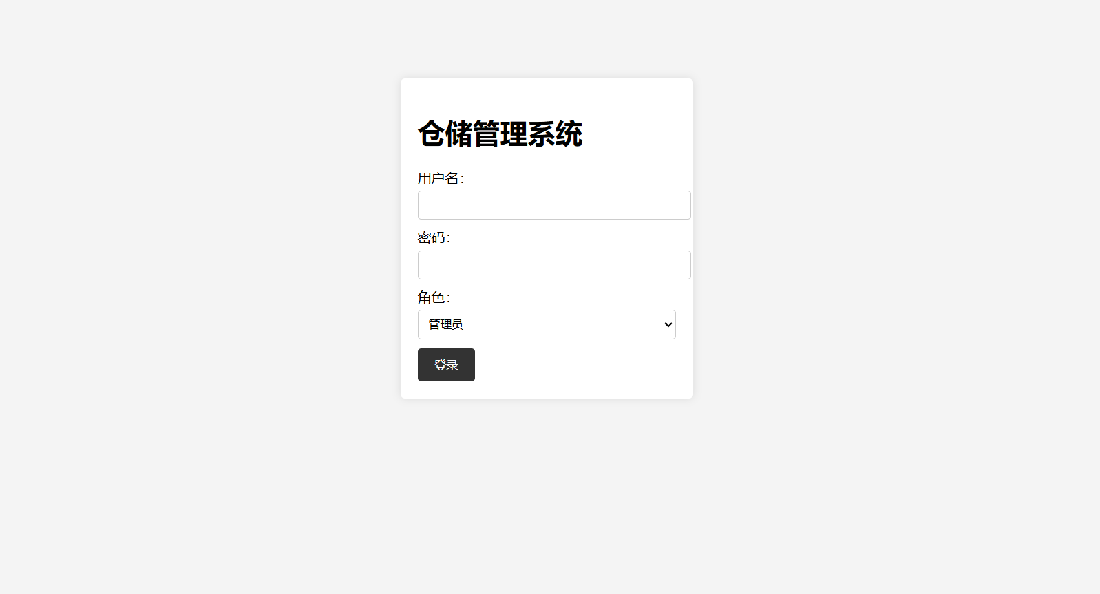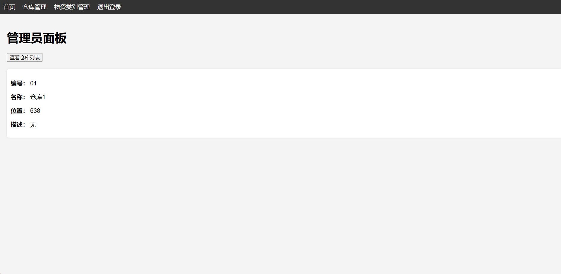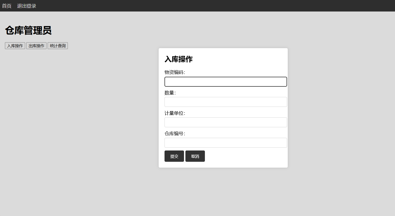 页面要求采用统一风格的模板,需要实现用户登录界面,管理员、仓库管理人员统一登录界面登录后,显示各自不同的菜单项,管理员功能页中可以实现仓库的新增、删除、修改基本信息管理,可以实现对物资类别的新增、删除、修改基本信息管理,仓库管理人员功能页入库操作,出库操作,统计查询功能。