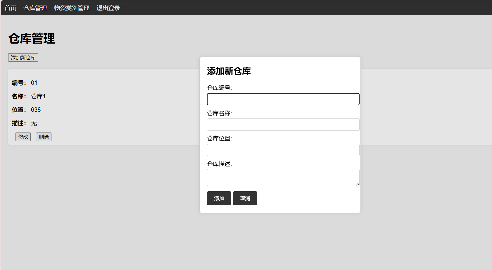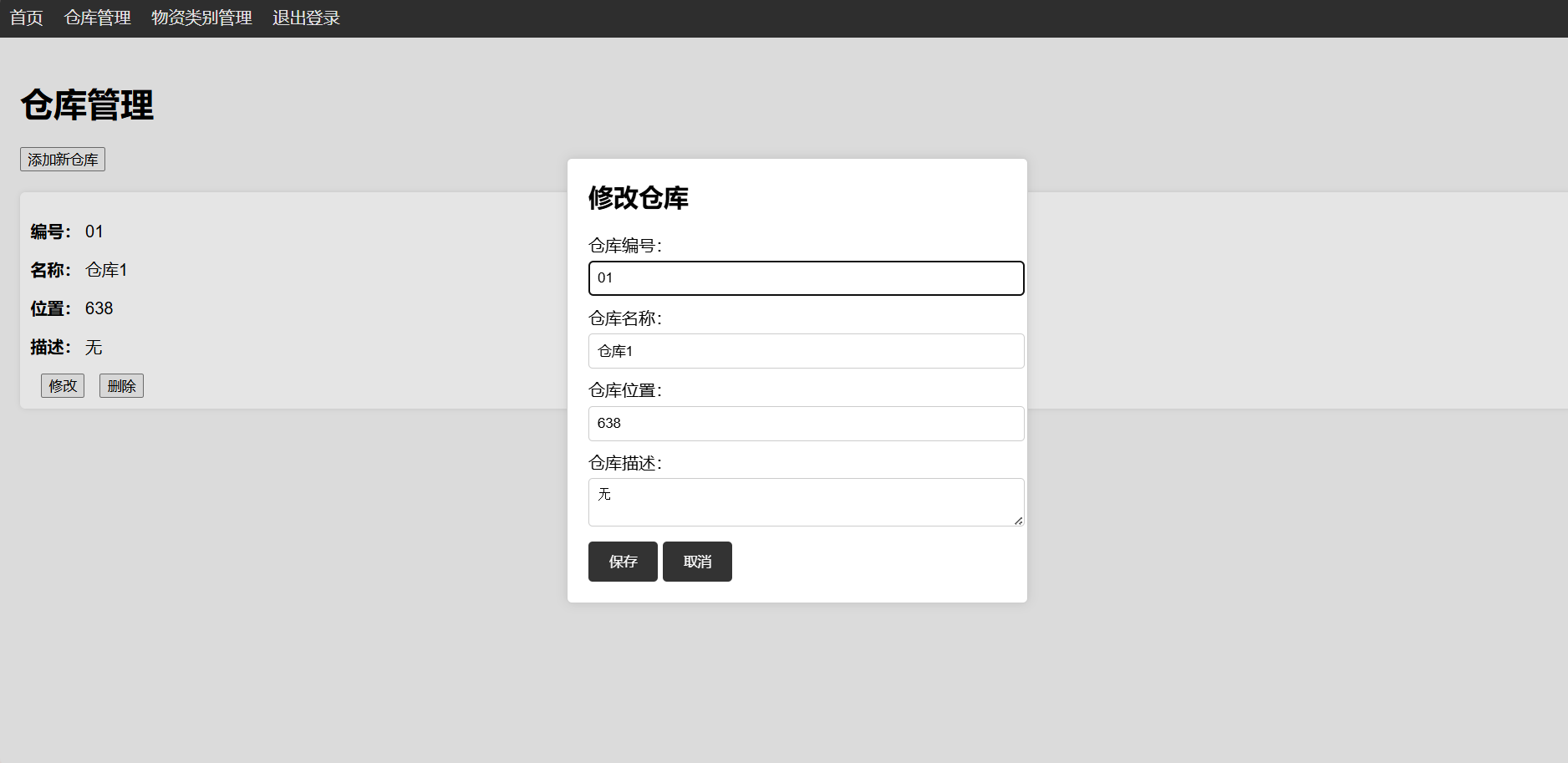 (3)修改仓库:仓库编号唯一不允许修改,并且验证没有相关物资存储在该仓库中,否则不允许修改仓库信息。