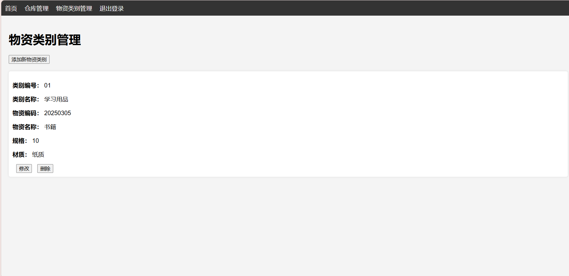 (6)修改物资类别基本信息:物资类别编号唯一不允许修改,并且验证物资台账明细表中是否存在该类物资,如果存在不允许修改该物资类别信息。