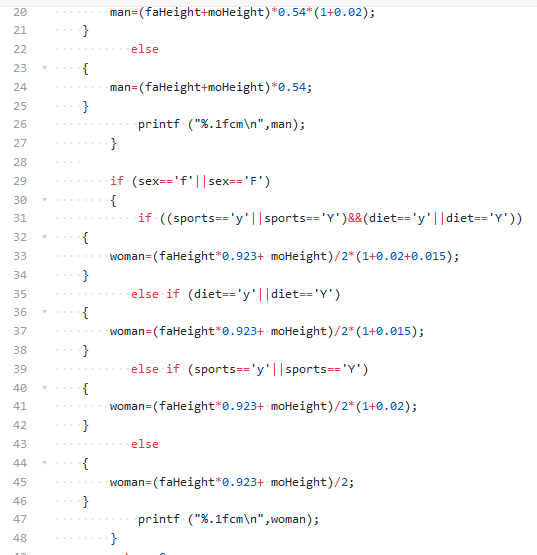 数据表达:本题用的变量很多,有双精度浮点型和字符型;它们都是题目要求的变量。man和woman是我自己定义的变量,用于记录最后男孩或女孩的身高,它们都是双精度浮点型。