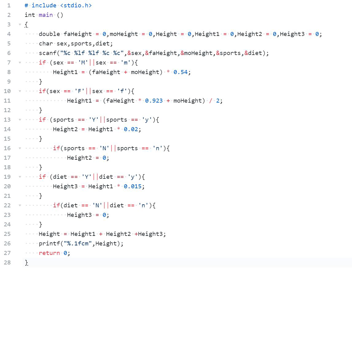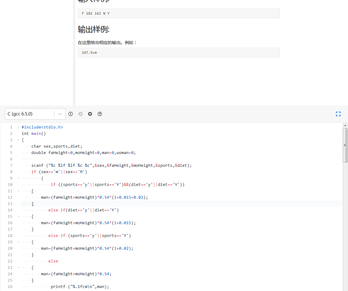 试编程从键盘输入用户的性别(用字符型变量sex存储,输入字符F或f表示女性,输入字符M或m表示男性)、父母身高(用实型变量存储,faHeight为父亲的身高,moHeight为母亲的身高)、是否喜爱体育锻炼(用字符型变量 sports存储,输入字符Y或y表示喜爱,输入字符N或n表示不喜爱)、是否有良好的饮食习惯(用字符型变量diet存储,输入字符Y或y表示良好,输人字符N或n表示不好)等条件,利用给定公式和身高预测方法对身高进行预测。