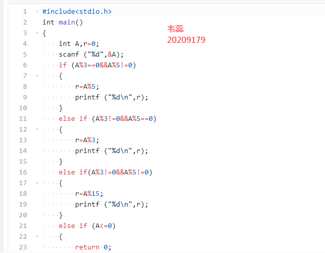 键盘输入1个正的整数A,如果A是3的倍数但不是5的倍数,则输出A除以5的余数。如果A是5的倍数但是不是3的倍数,则输出A除以3的余数。如果A既不是5的倍数但也不是3的倍数,输出A除以15的余数