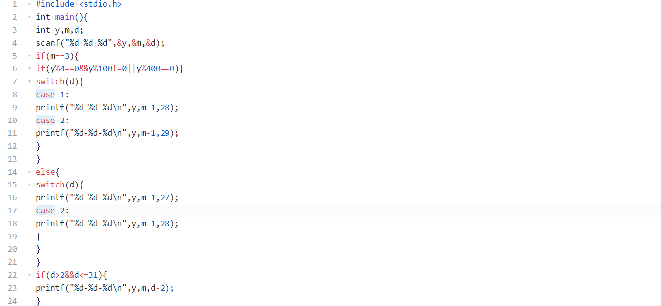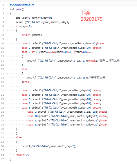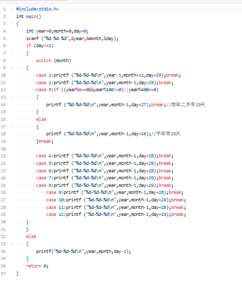 本题目要求读入年、月、日,然后判断前天日期。