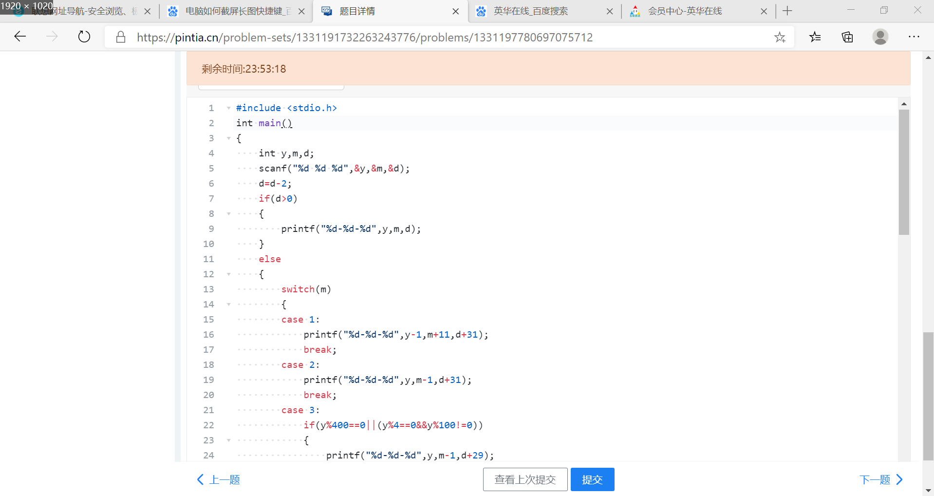 1,部分正确:判断闰年的条件应该写在case 3里面吗,而我写在case 2里面了,后来明白后就改了回来。