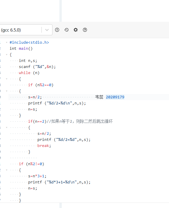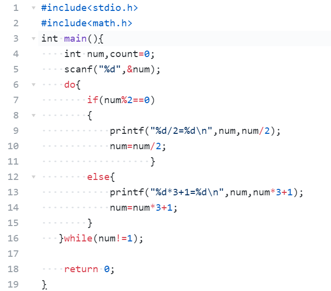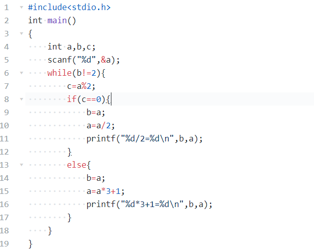 | 6 | 6/2=3 33+1=10 10/2=5 53+1=16 16/2=8 8/2=4 4/2=2 2/2=1 | 输入为奇数 |