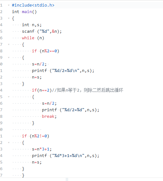 数据处理:用if语句来分支判断如果输入的数是偶数则分支到一边,如果输入的数是奇数则分支到另一边,最后当n等于2时跳出循环然后输出。
