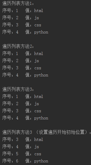 22 print '\n遍历列表方法3 (设置遍历开始初始位置,只改变了起始序号):'