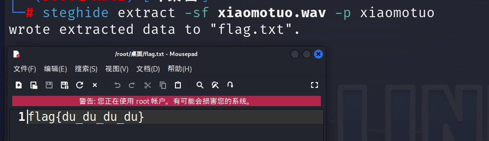 steghide extract -sf xiaomotuo.wav -p xiaomotuo