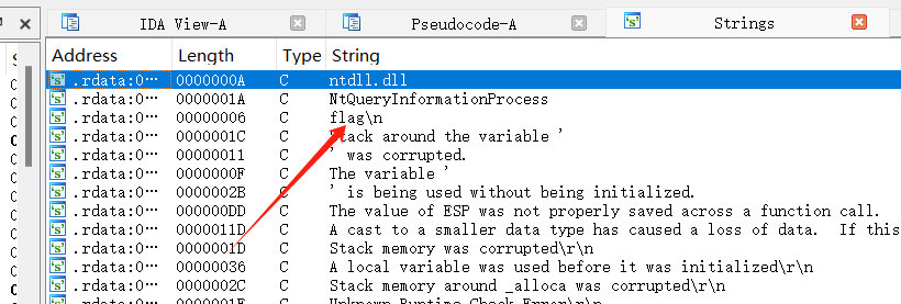IDA加载进去,Shift+F12找到疑似flag的字符串,双击进去