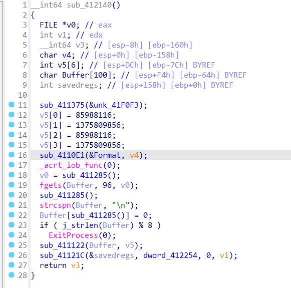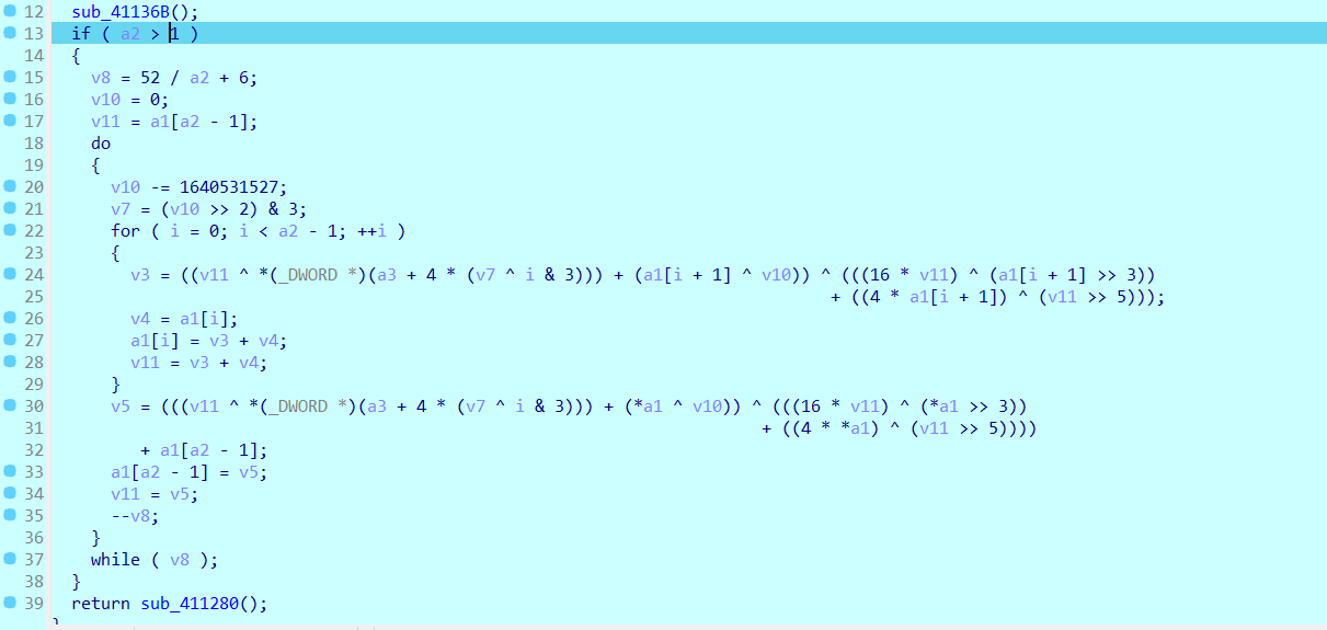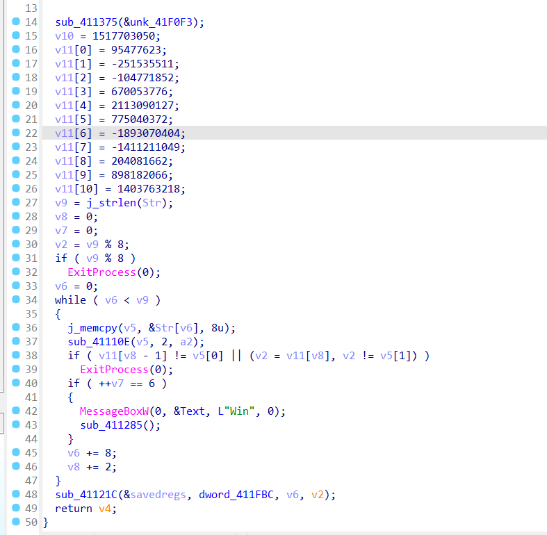 这下闭着眼睛都能知道是TEA系列了,然后注意到sub_411122函数双击进去