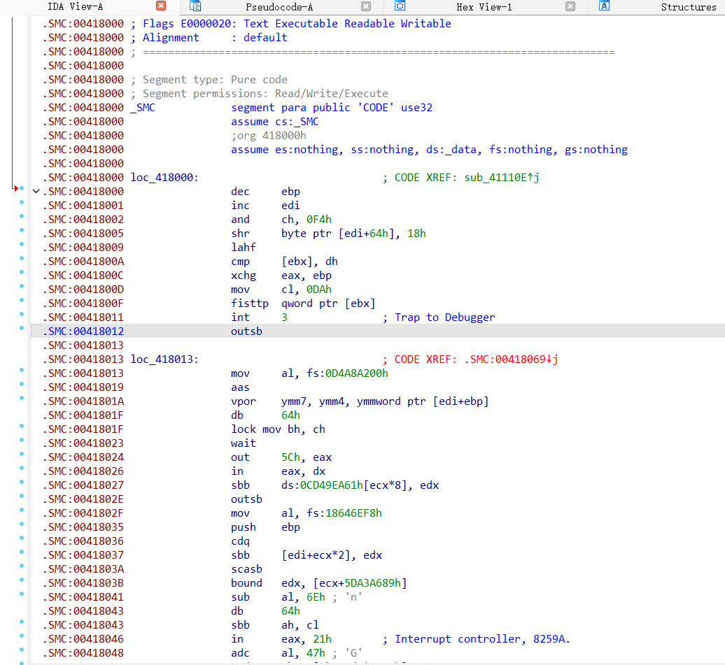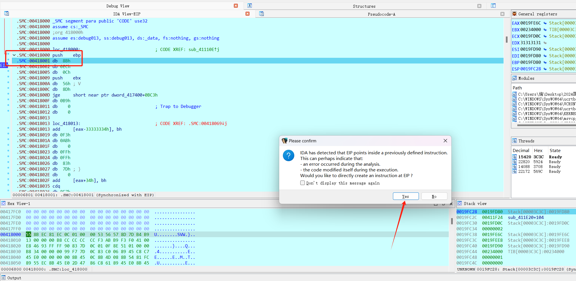 运行到标记地点,会出现弹窗点Yes,然后在00418000处按P,函数就出来了