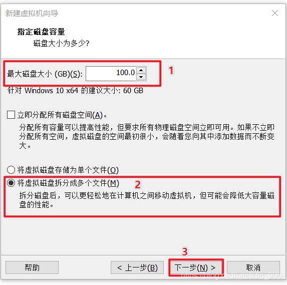 根据宿主机的配置自定义虚拟机磁盘大小 -- 》 将磁盘拆分成多个文件 -- 》 下一步