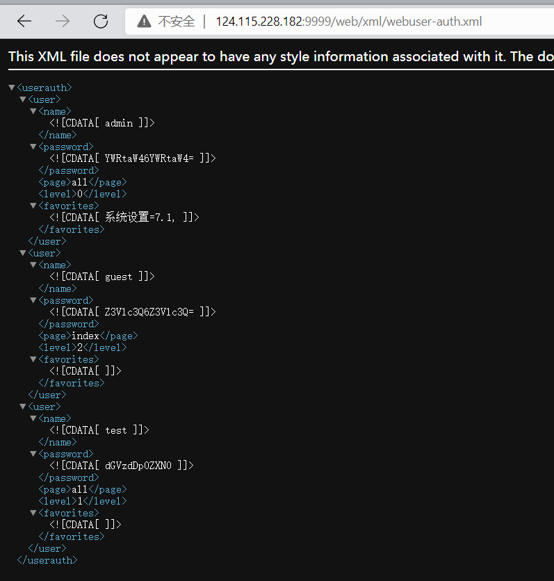 步骤二:进入后在其地址后面添加以下路径访问/web/xml/webuser-auth.xml 其中存在管理员账号与base加密的密码并进解密