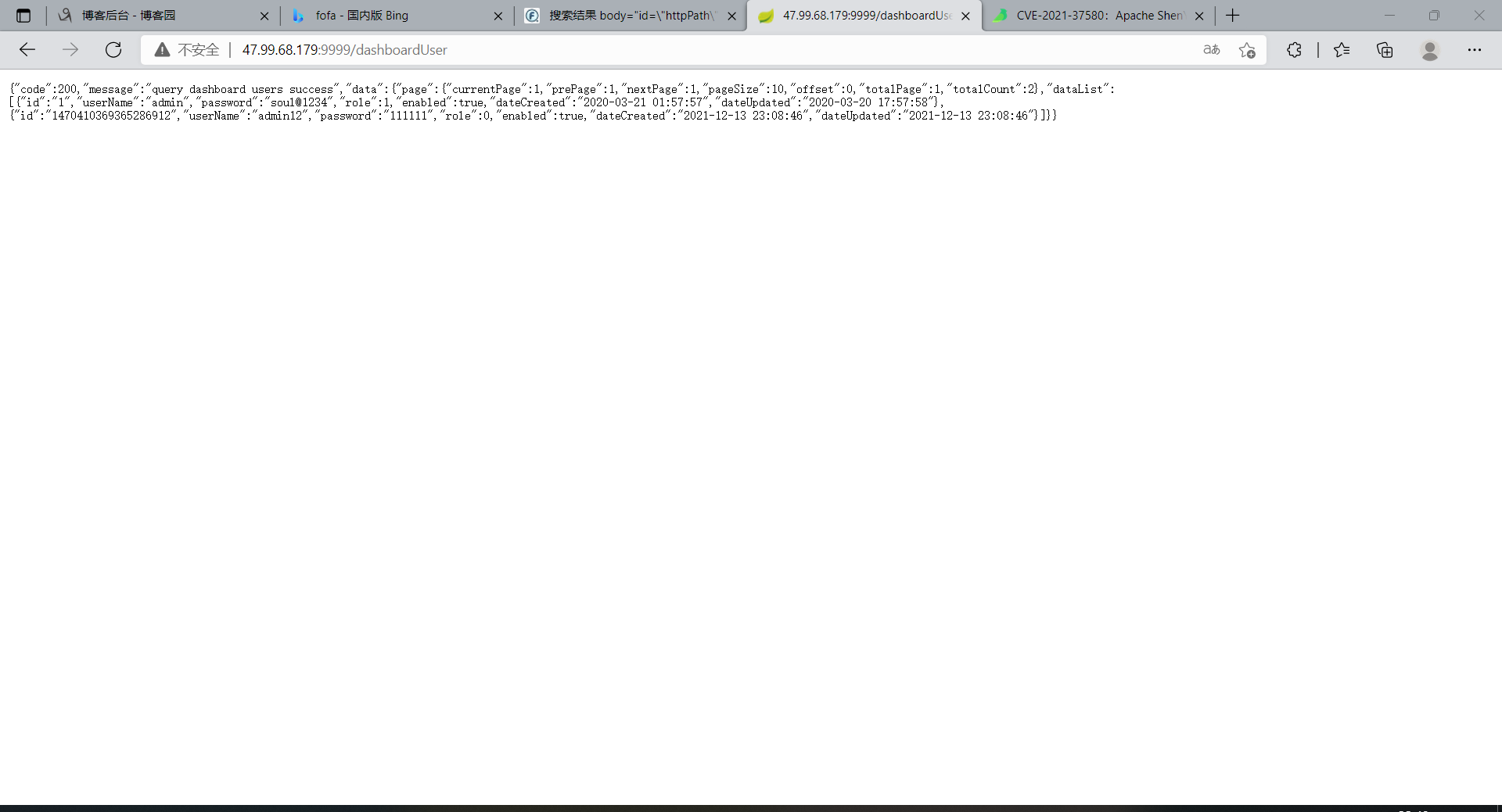 步骤二:点击47.99.68.179.9999域名,对其可以正常访问的进行路径拼接并访问(/dashboardUser),访问之后若存在漏洞则可查看登录用户密码信息...