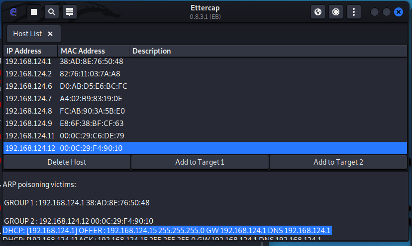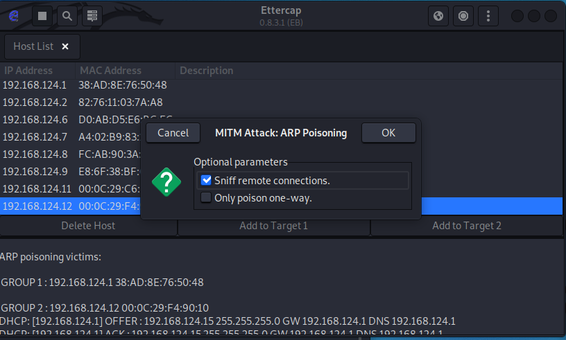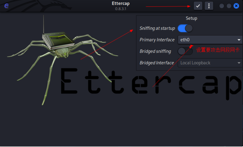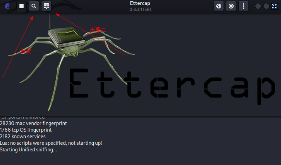 步骤四:在KALI上输入ettercap -G命令启动Ettercap图形化界面...并进行以下操作...