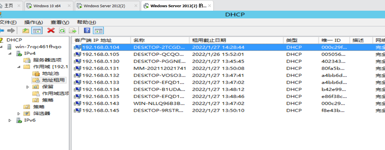 步骤一:准备克隆一台Windows server 2012服务器并按照1.1的搭建好DHCP服务(取名为Windows server 2012的克隆)...