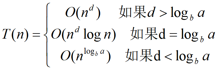 设a>=1和b>1是常数,f(n)是一个函数,T(n)是定义在非负整数集上的函数:T(n)=aT(n/b)+ O(nd) 。