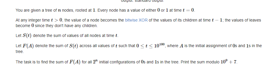 大概就是说有个树,每个节点都可能是1或者是0,每过一秒所有节点的值都会变成它们儿子异或起来的值,叶子则会直接变成0,求所有可能的树的初始状态下每秒1棵树所有节点的和的和(有点绕)