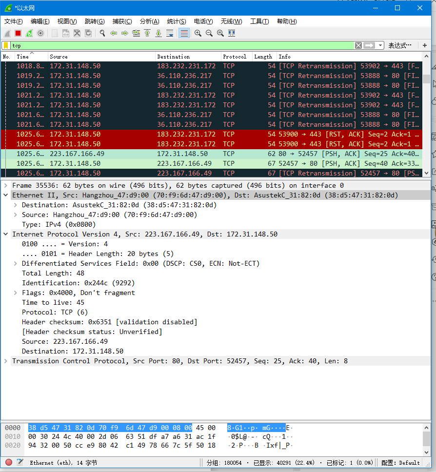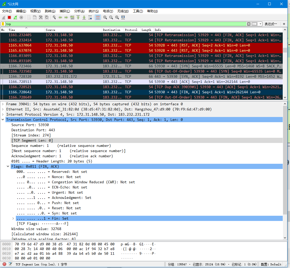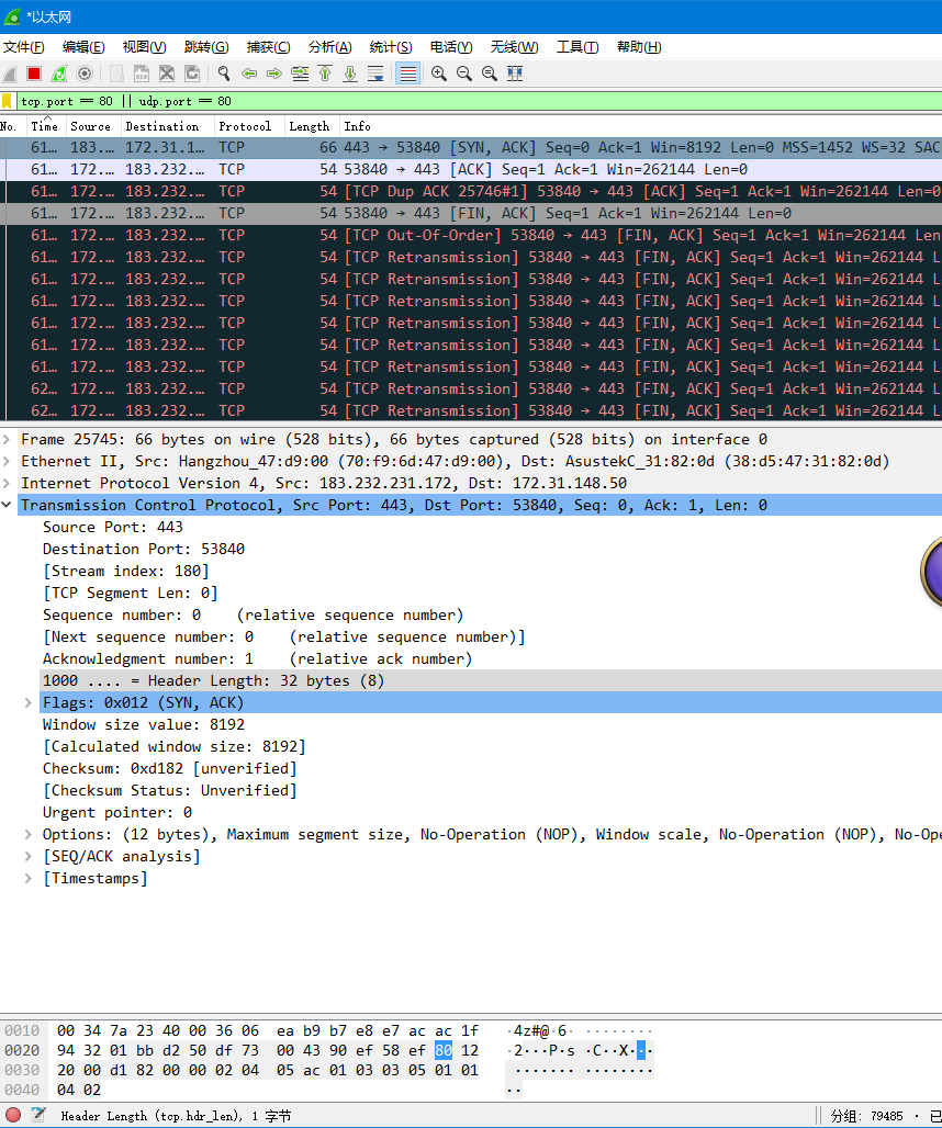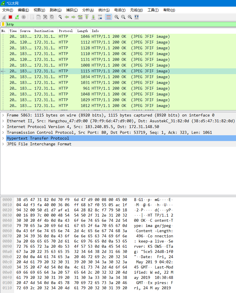 在追踪到的TCP流中,可以看到在HTTP之前有三次TCP数据交互,分别是