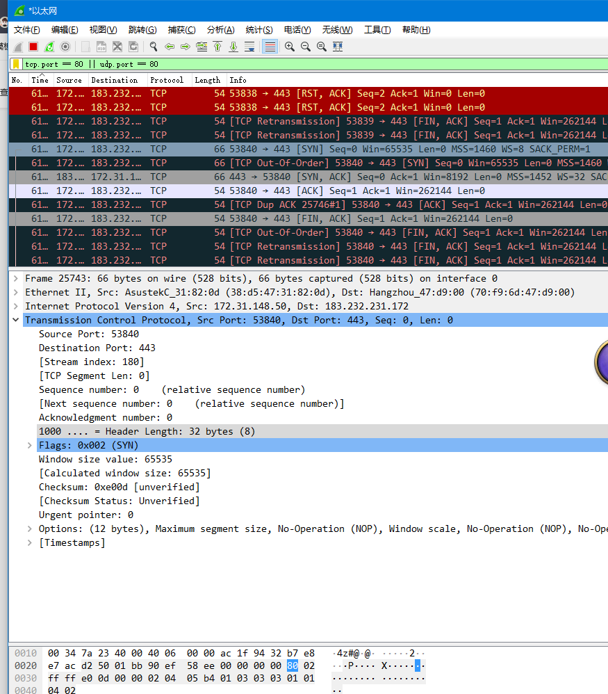 本机通过发送一个TCP报文段向服务器发起连接请求,该报文段被称为SYN报文段, 不包含应用数据,Syn的值被置为1,后面可以看到在连接未建立成功时,Syn的值都为1,连接建立成功之后,Syn为0,它表示本机和服务器都已经连接成功,可以进行数据传输。