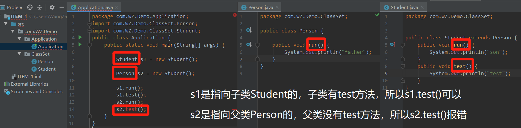 解释下5中第二句话:子类有一个方法,父类没这个方法,父类 对象 = new 子类();则,该对象不能调用父类没有,子类有的这个方法。否则报错: