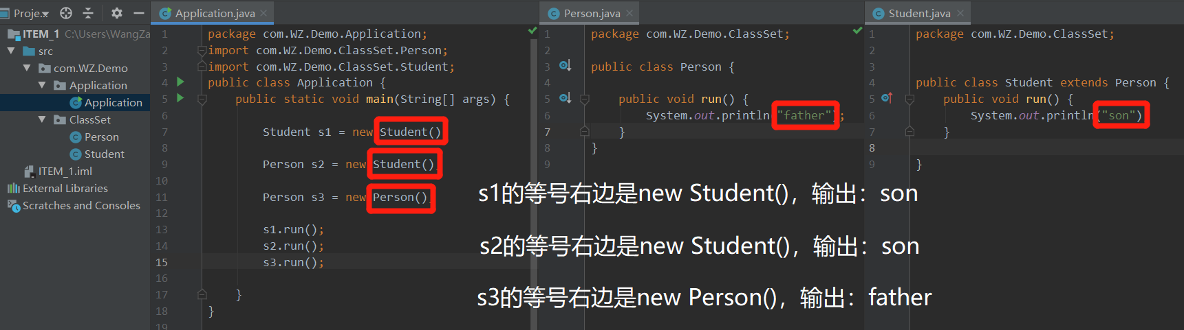 存在条件:有继承关系,方法需要重写,父类引用指向子类对象(反过来不行,只能父类指向子类)。Father f1 = new Son();