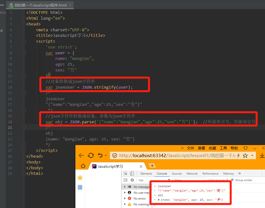 var obj = JSON.parse('{"name":"WangZan","age":25,"sex":"男"}'); //外面单引号,里面双引号