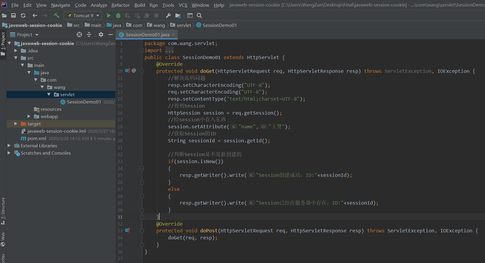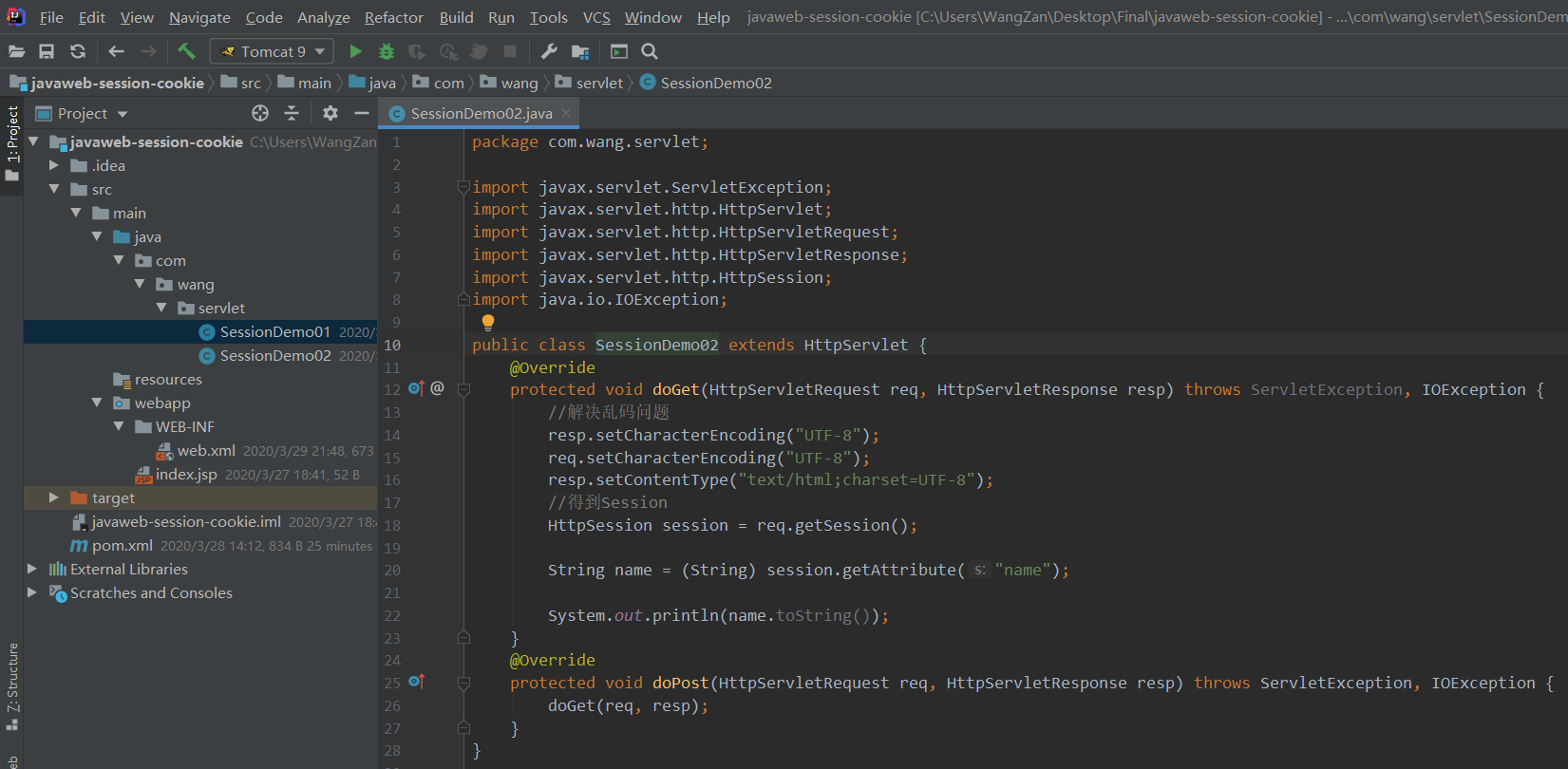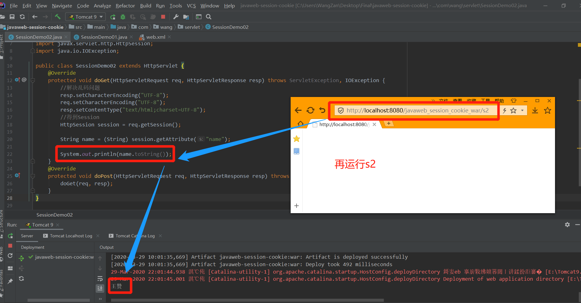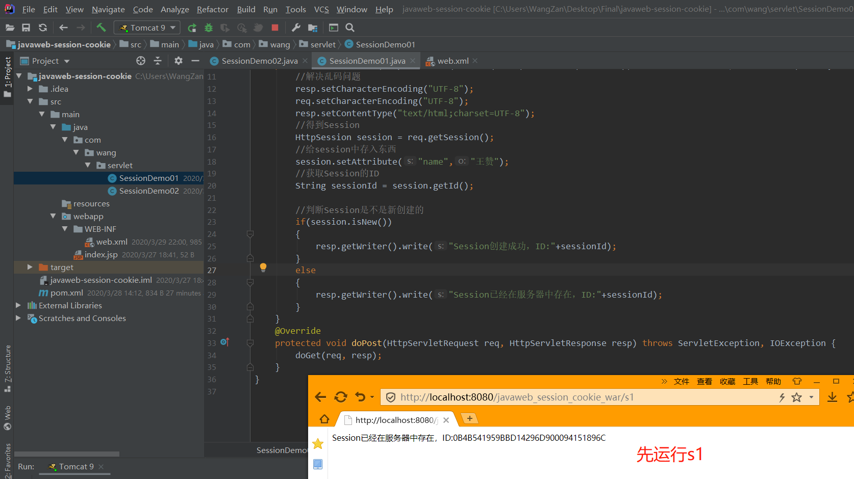 以下1-5执行的是:在Demo01类中用Session存字符串数据(王赞),在Demo02类中用Session读字符串数据。