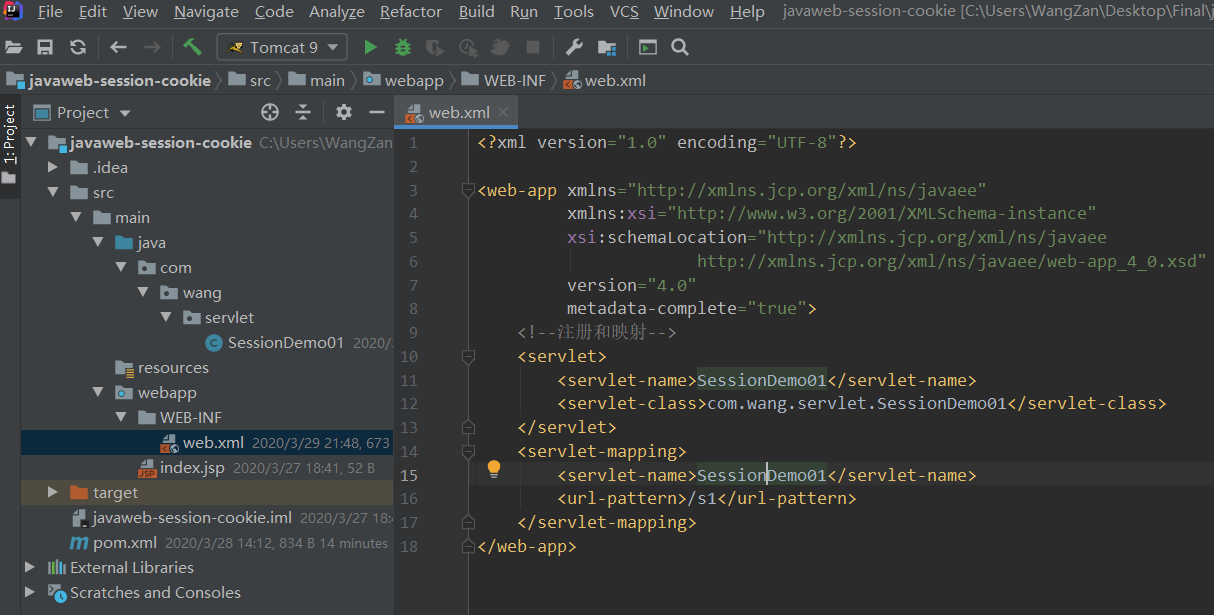 1 <?xml version="1.0" encoding="UTF-8"?> 2 3 <web-app xmlns="http://xmlns.jcp.org/xml/ns/javaee" 4 xmlns:xsi="http://www.w3.org/2001/XMLSchema-instance" 5 xsi:schemaLocation="http://xmlns.jcp.org/xml/ns/javaee 6 http://xmlns.jcp.org/xml/ns/javaee/web-app_4_0.xsd" 7 version="4.0" 8 metadata-complete="true"> 9 <!--注册和映射--> 10 <servlet> 11 <servlet-name>SessionDemo01</servlet-name> 12 <servlet-class>com.wang.servlet.SessionDemo01</servlet-class> 13 </servlet> 14 <servlet-mapping> 15 <servlet-name>SessionDemo01</servlet-name> 16 <url-pattern>/s1</url-pattern> 17 </servlet-mapping> 18 </web-app>