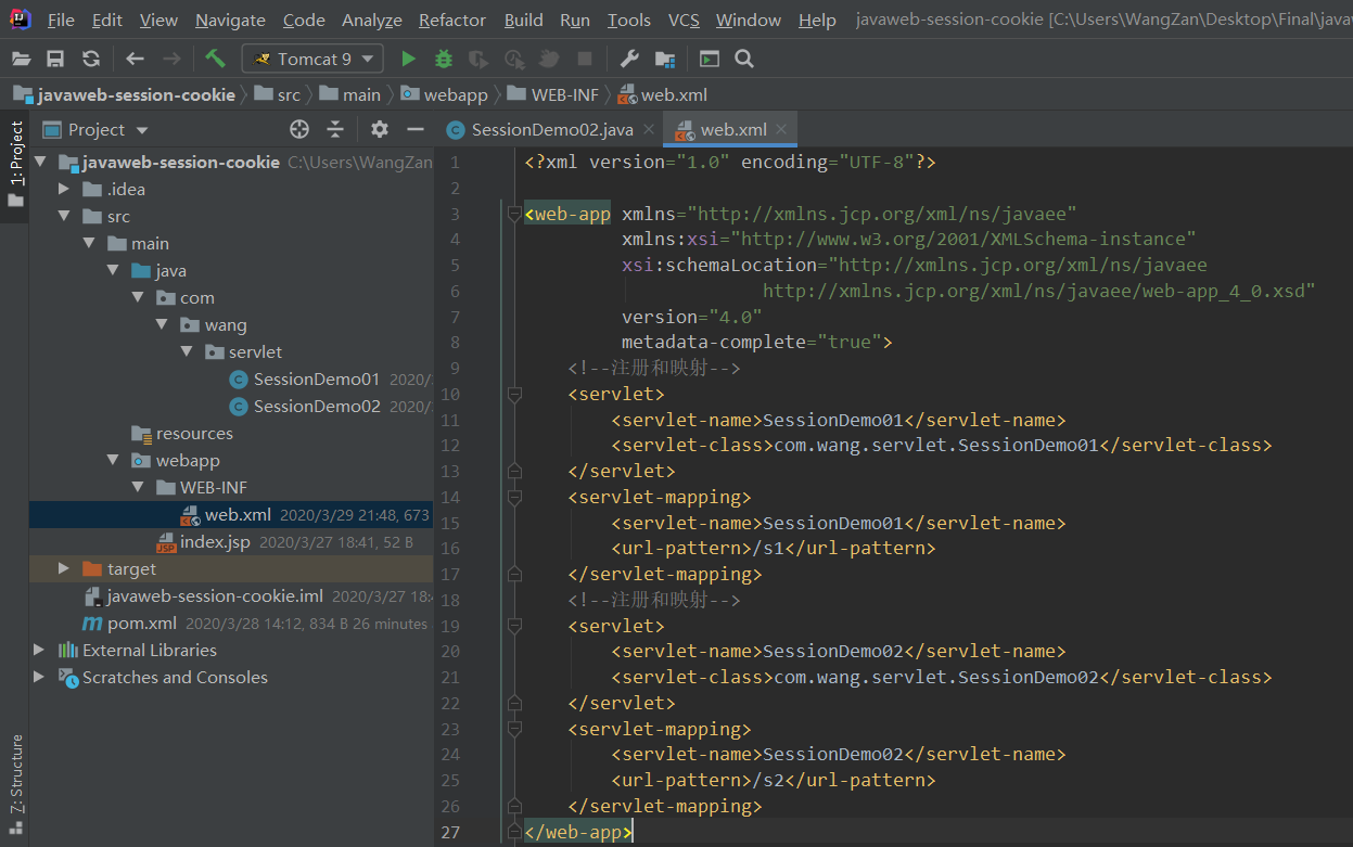 1 <?xml version="1.0" encoding="UTF-8"?> 2 3 <web-app xmlns="http://xmlns.jcp.org/xml/ns/javaee" 4 xmlns:xsi="http://www.w3.org/2001/XMLSchema-instance" 5 xsi:schemaLocation="http://xmlns.jcp.org/xml/ns/javaee 6 http://xmlns.jcp.org/xml/ns/javaee/web-app_4_0.xsd" 7 version="4.0" 8 metadata-complete="true"> 9 <!--注册和映射--> 10 <servlet> 11 <servlet-name>SessionDemo01</servlet-name> 12 <servlet-class>com.wang.servlet.SessionDemo01</servlet-class> 13 </servlet> 14 <servlet-mapping> 15 <servlet-name>SessionDemo01</servlet-name> 16 <url-pattern>/s1</url-pattern> 17 </servlet-mapping> 18 <!--注册和映射--> 19 <servlet> 20 <servlet-name>SessionDemo02</servlet-name> 21 <servlet-class>com.wang.servlet.SessionDemo02</servlet-class> 22 </servlet> 23 <servlet-mapping> 24 <servlet-name>SessionDemo02</servlet-name> 25 <url-pattern>/s2</url-pattern> 26 </servlet-mapping> 27 </web-app>
