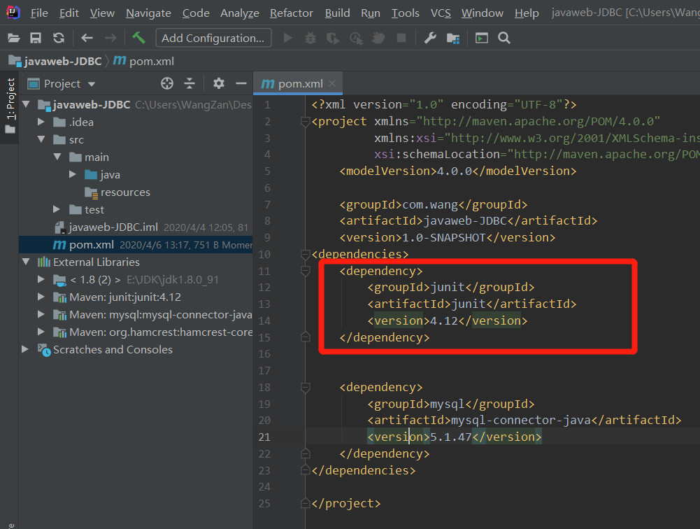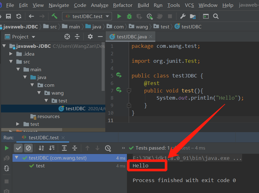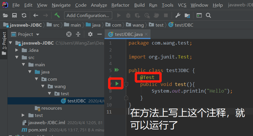 作用:不需要有main函数,在想要测试的某个方法上写上@Test注解,就可以直接运行。注意:它只在目标方法上有效。