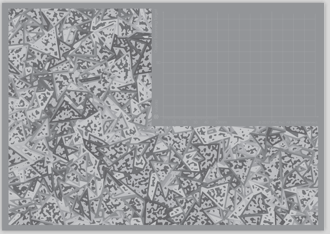 Vuforia Object Scanner 下载软件包中以pdf格式包含可打印的“对象扫描”目标图像 。打印它以缩放比例,以维持3D对象和对象目标之间的尺寸参数。