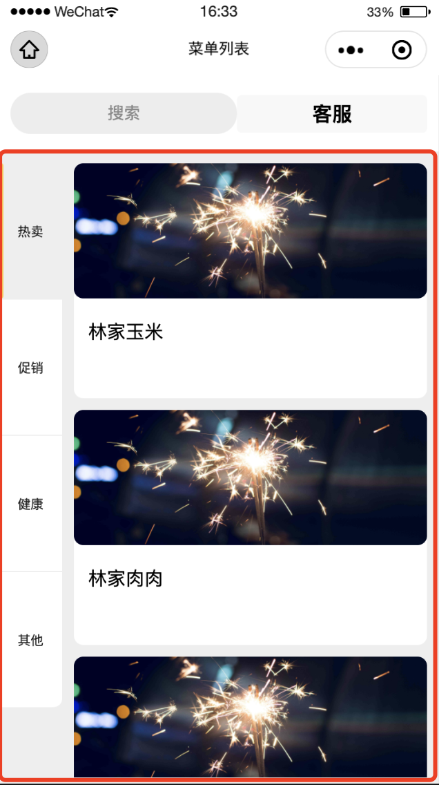 仿美团外卖菜单分类,左右联动功能,顶部为轮播图,以及客服部分,主体部分为联动功能,滚动时,客服部分也显示在页面内,主体部分在红圈内。话不多说,直接上图