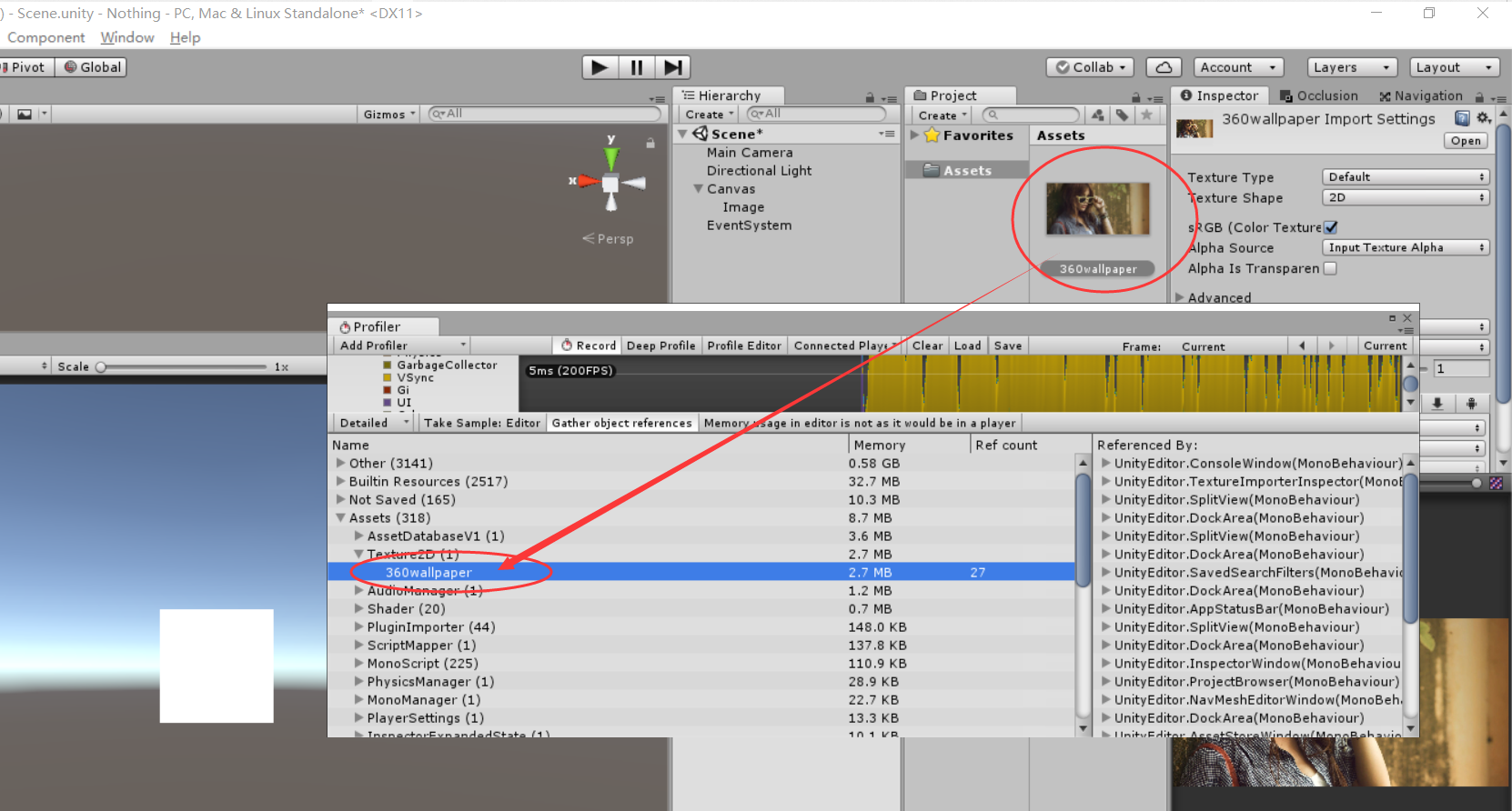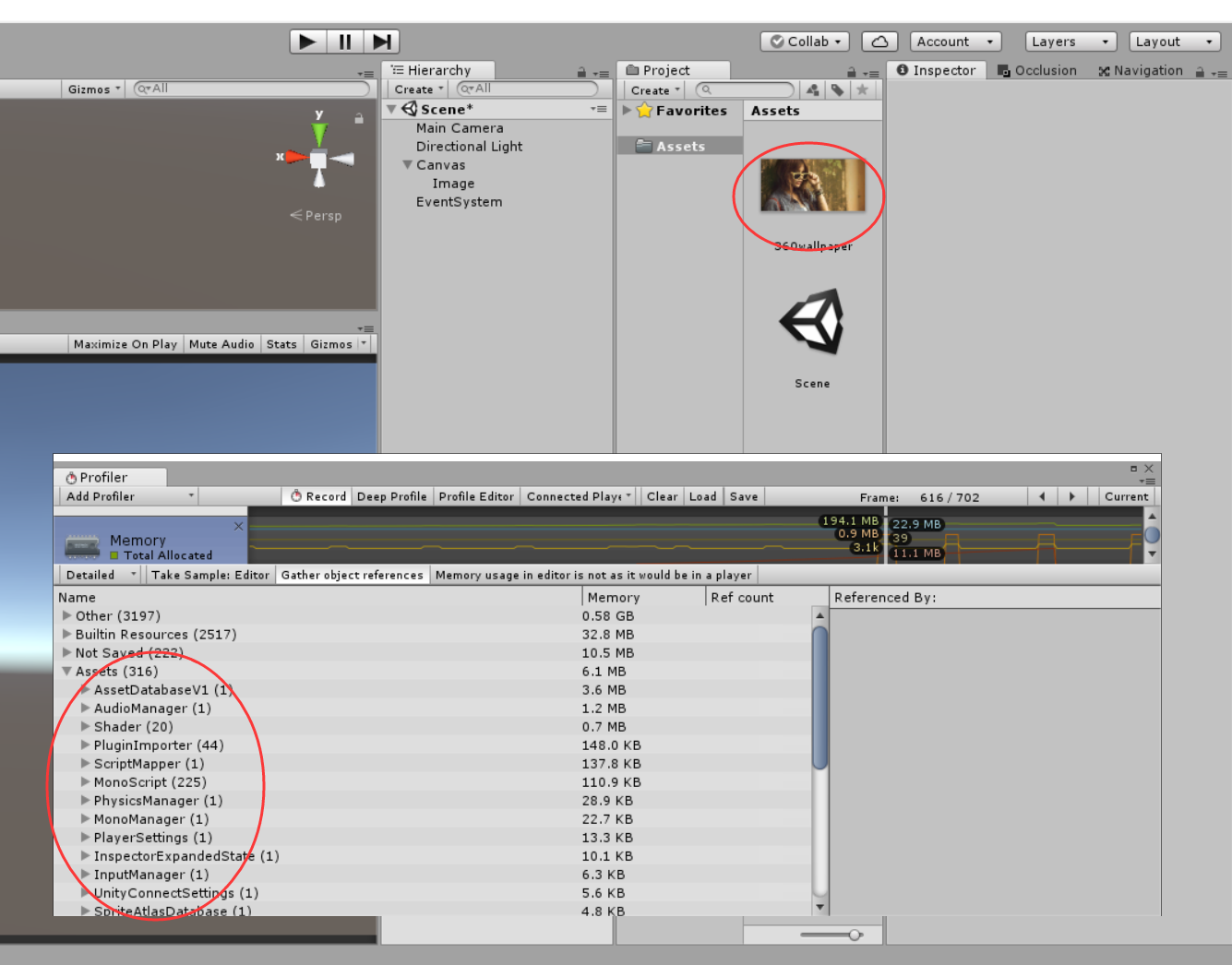 unity场景中创建的物体与加载的资源之间是引用的关系(例如一张Image图片和一张外部导入的贴图),当贴图导入进unity中但并不引用该资源,但是仍然在内存中自动加载了该资源。原因是在unity中一般在加载与卸载场景中物体的操作是很频繁的,