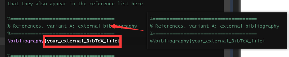 找到前不远处bibliography的内容,去掉注释,换用自己新建的bib文件的名称,注意只是名称,不要带后缀