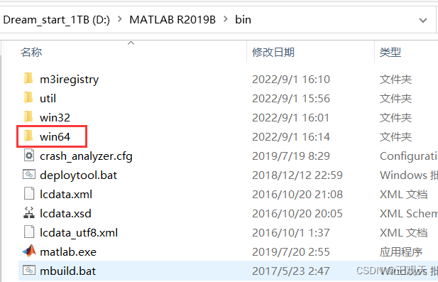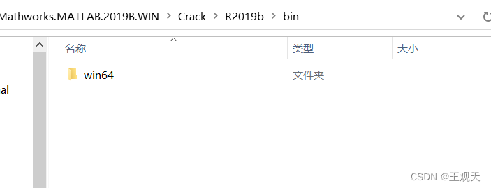 找到前面下载解压的安装包文件夹,该文件夹下有个Crack文件夹,如下图点击进入Crack\R2019b\bin文件夹,复制该文件夹下的win64文件夹
