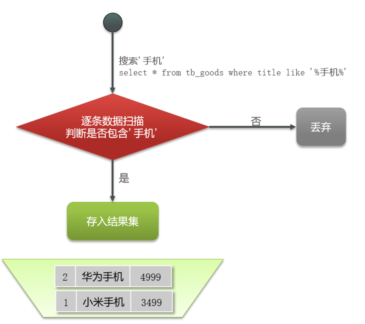 比如:现在我需要查询title包含手机的数据(select * from xxx where title like '%手机%'),会逐条检索,查找符合包含手机的数据,存入结果集