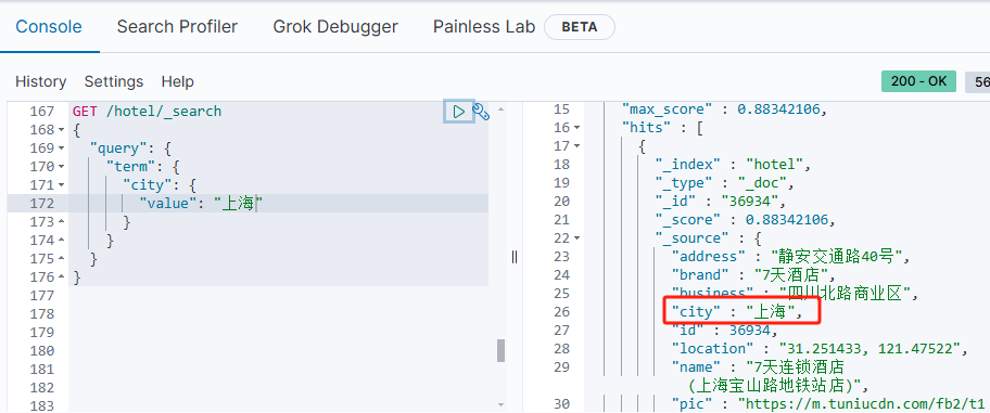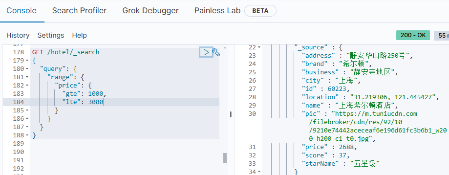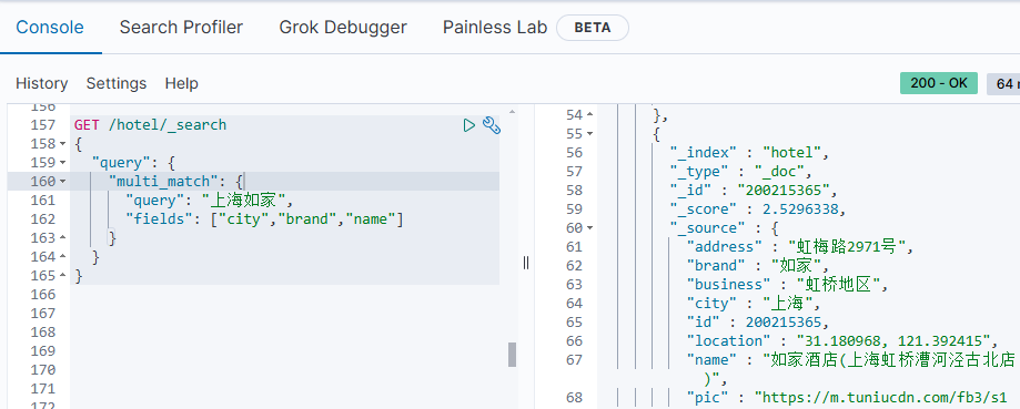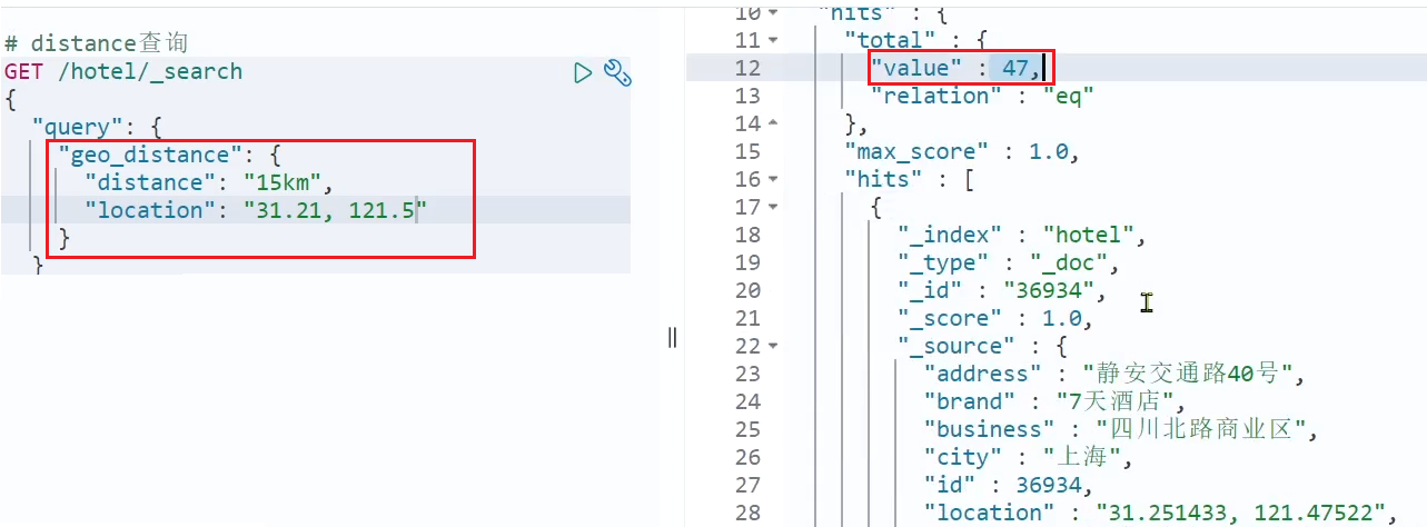 GET /hotel/_search { "query": { "bool": { "must": [ {"multi_match": {"all": "" }} ], "must_not": [ { "range": { "price": { "lte": 500 } }} ], "filter": [ { "term": {"city": "" }}, { "term": {"brand": "" }}, { "term": {"starName": "" }} ] } } }