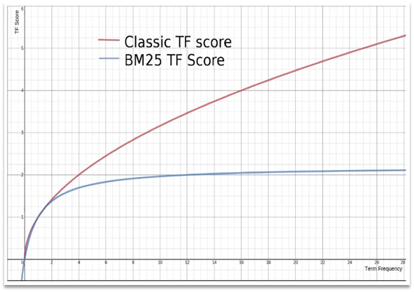 TF-IDF算法有一各缺陷,就是词条频率越高,文档得分也会越高,单个词条对文档影响较大。而BM25则会让单个词条的算分有一个上限,曲线更加平滑: