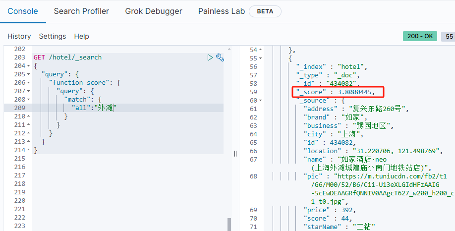[ { "_score" : 17.850193, "_source" : { "name" : "虹桥如家酒店真不错", } }, { "_score" : 12.259849, "_source" : { "name" : "外滩如家酒店真不错", } }, { "_score" : 11.91091, "_source" : { "name" : "迪士尼如家酒店真不错", } } ]